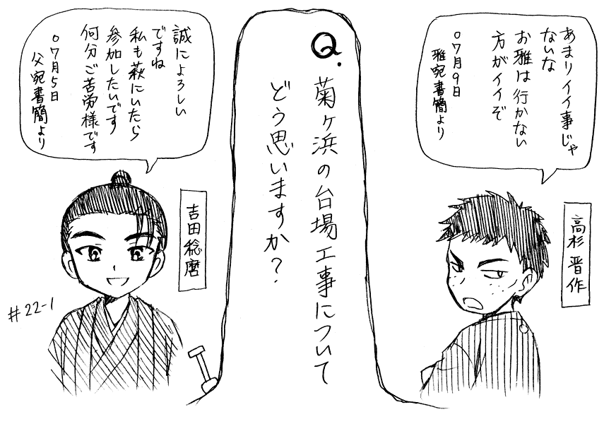この台場工事に対して、稔麿と高杉の意見が分かれているのが面白いです。