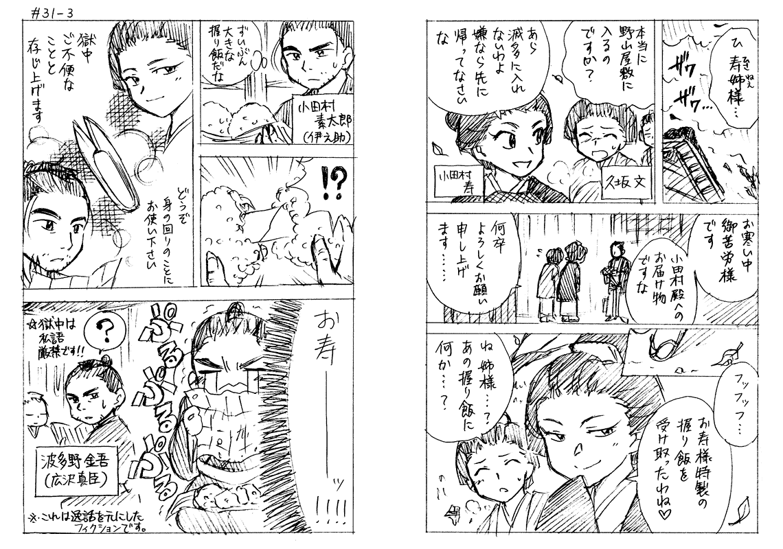 ドラマではおむすびに手紙を忍ばせていましたが、史実ではおむすびの中にハサミを隠して差し入れた、という話があります。